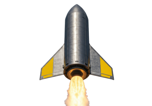 Silver space rocket launching with yellow fins isolated on transparent PNG, futuristic spacecraft for science and technology concepts