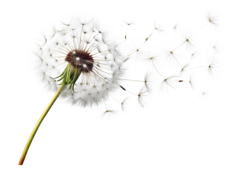 Dandelion Blowing in Wind on White Background  ,PNG. AI Generated