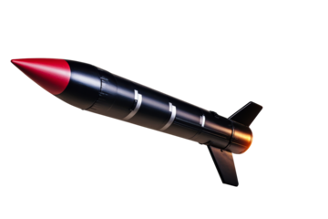 Sleek black rocket with red tip and fins launches with fiery exhaust against white, cut out transparent
