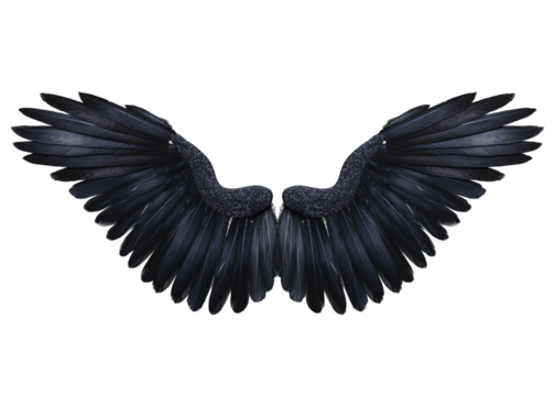 A pair of black feather wings on a transparent, isolated background. Cut out or PNG.
