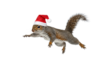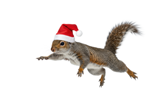 majestic eastern gray squirrel wearing a miniature santa hat, captured mid-flight against a transparent studio background, high-speed action shot. christmas holiday celebration concept