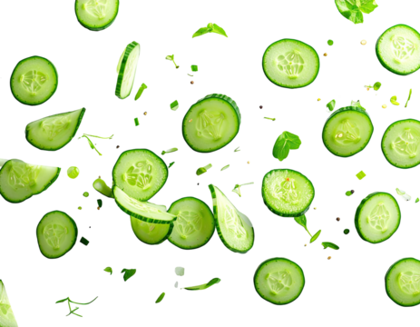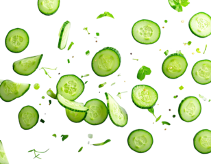 Sliced cucumbers in mid-air, against a black background.  Fresh, vibrant, green cucumber slices, various shapes and sizes, appear to be falling or flying