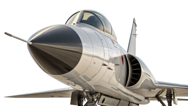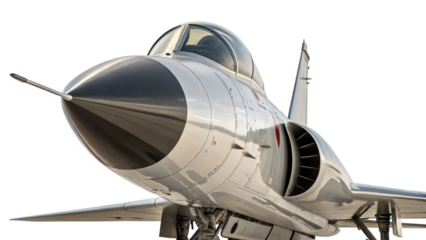 Closeup of a modern fighter jet airplane nose and cockpit, isolated on transparent background