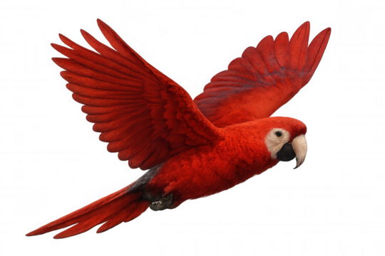 Scarlet macaw spreading vivid red-blue-yellow feathers, flying freely with extended wings against transparent backdrop