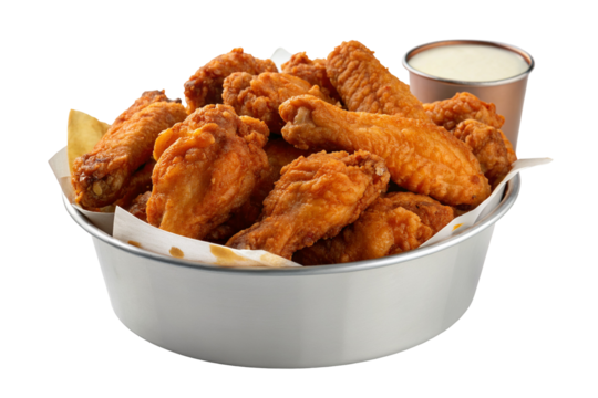 Delicious chicken wings with dipping sauce on a white plate isolated on transparent background