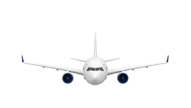 A white airplane with blue tail and wingtips on a black background in a side view perspective