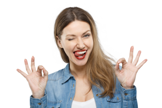 Playful woman winking and making OK gesture with both hands
