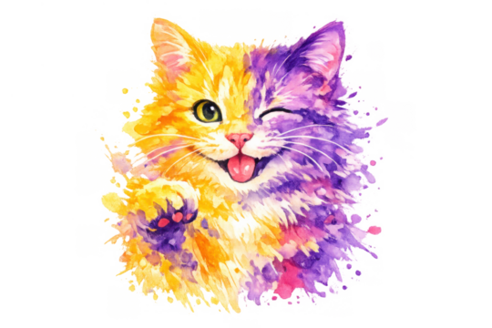 Watercolor cat winking and sticking out tongue, featuring vibrant yellow and purple brushstrokes creating an artistic splash effect. Transparent background