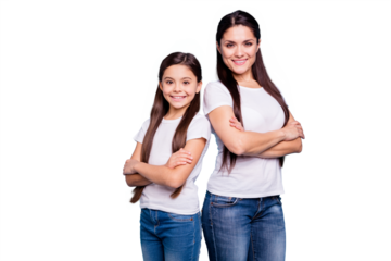 Close up photo pretty two people brown haired mum small little daughter crossed arms self-confidently stand back to back ready win winner family games wear t-shirts isolated bright blue background