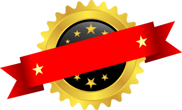 Gold Starburst Award Badge with Blank blue diagonal Ribbon Banner, A vector design of a blank golden starburst award seal featuring a prominent black horizontal banner for custom text and decorativ