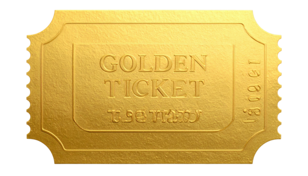 A golden, ornate ticket with "GOLDEN TICKET" inscribed on it