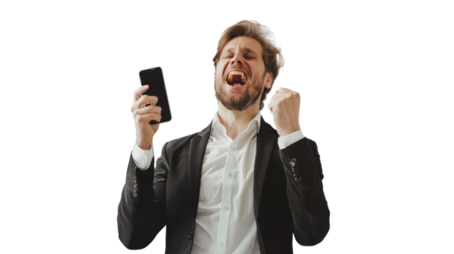 Euphoric biracial athlete kneeling in triumph on transparent background
