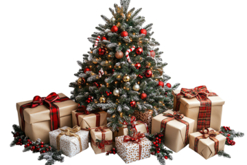 Fully decorated artificial evergreen tree on a black stand against a transparent background