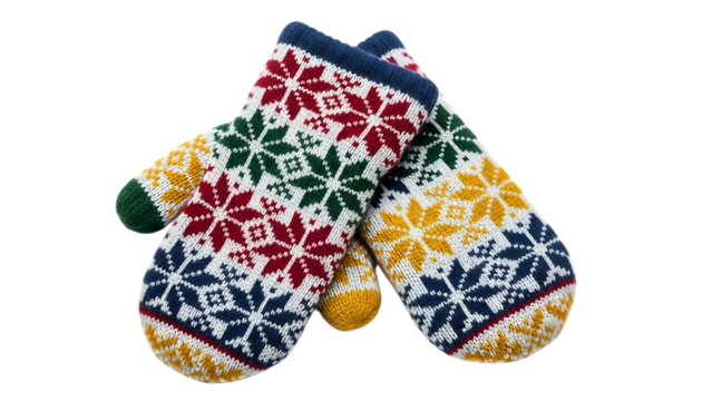 Isolated hand-knitted mitten with a green cuff, winter-themed apparel, woolen accessory