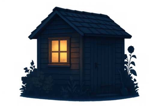 Cozy garden shed with warm light glowing from window at night, offering a peaceful, isolated retreat, transparent background
