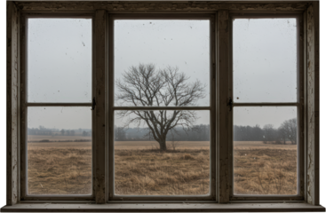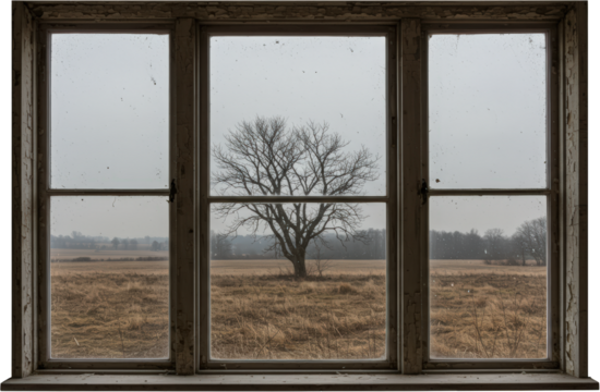Serene Winter Landscape Viewed Through Old Weathered Triple Window Pane