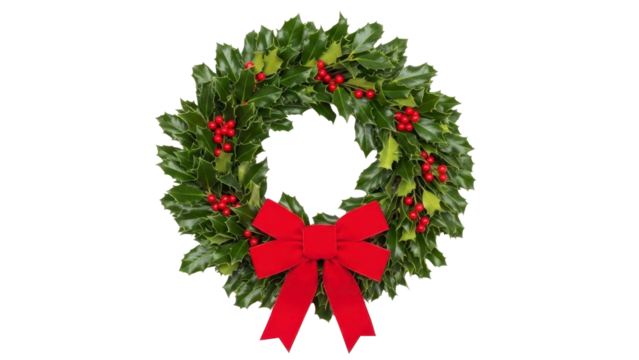 Traditional Christmas Holly Wreath with Red Berries and Velvet Bow on a Transparent Background PNG Image