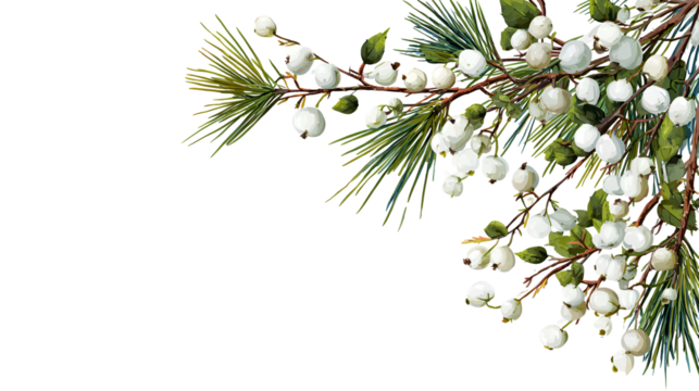 Winter Pine Branch with White Snowberries on Clean Serene Background