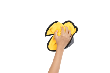 Human hand holding yellow rag and wiping table or cleaning something isolated on white background with clipping path.