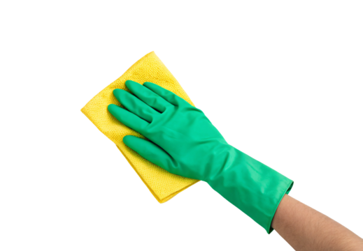 Hand wearing green glove wiping surface with yellow cloth, isolated on a transparent background