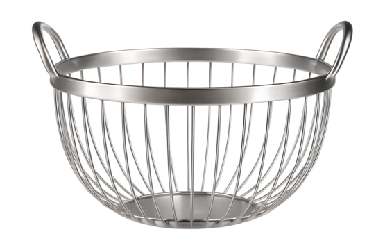 Empty metal wire shopping basket with red handles, isolated on transparent background