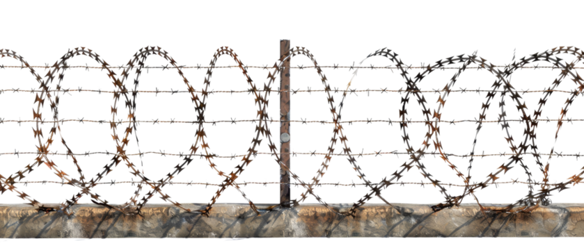 Barbed wire fence on top of concrete wall isolated on transparent background. Concept of restriction of freedom and prison