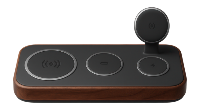 Black wireless charging pad with silver trim, isolated on transparent background