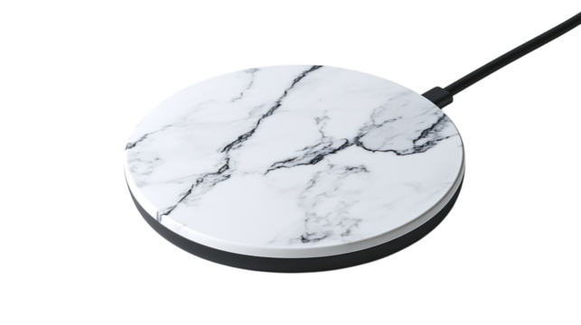• A sleek wireless charging pad with a marble surface, isolated on white background in HD