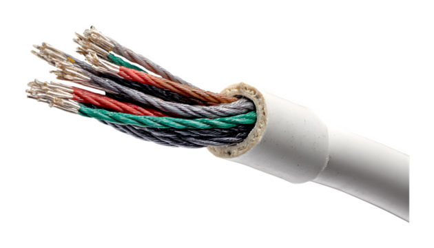 Colorful electrical cables are tangled together, forming a chaotic and disorganized mess against a transparent background, emphasizing the complexity and potential hazards of unmanaged wiring