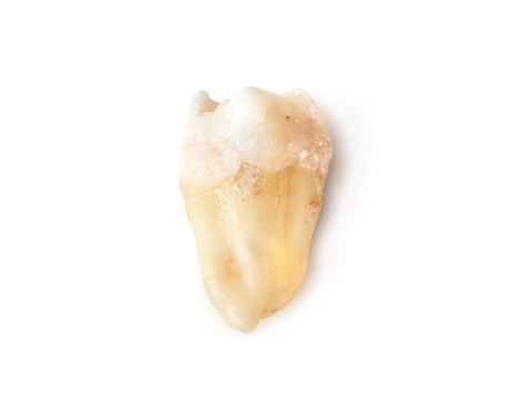 Isolated wisdom tooth after extraction. Real hole wisdom tooth or third molar with visible root and crown. Dental healthcare or clinical anatomy reference. Selective focus.