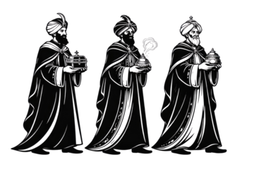 Three kings day or epiphany three regal figures in elaborate robes carrying gifts ready for compositing on white and transparent background