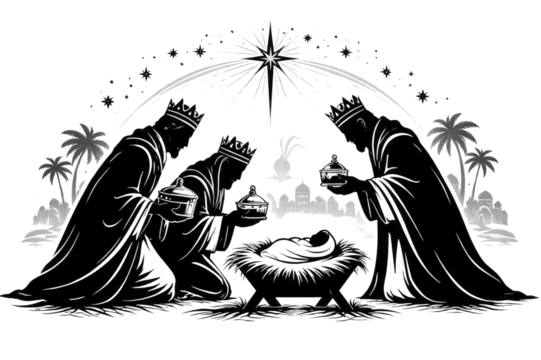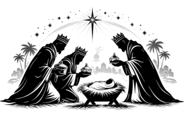 Three kings day or epiphany three figures in crowns presenting gifts to a newborn isolated on a neutral background with png background