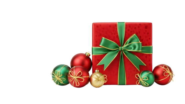 Red gift box with green ribbon and festive ornaments on white, symbolizing holiday cheer and thoughtful giving