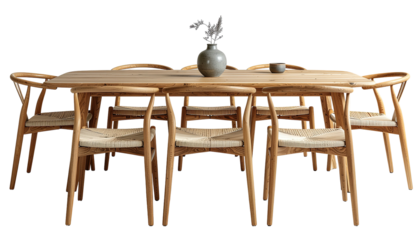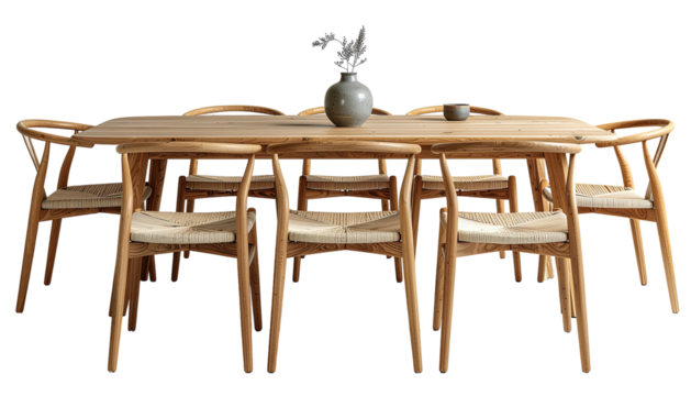 Wooden table with wishbone chairs, vase, cup