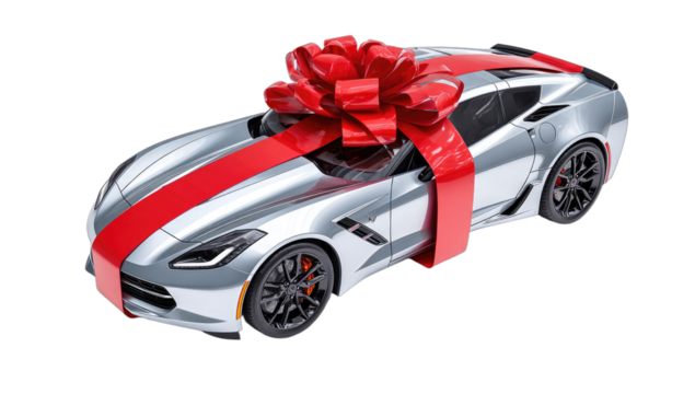 Sleek silver sportscar with a large red bow and ribbon, presented as a gift