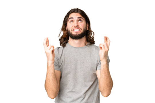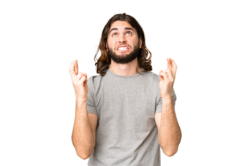 Young handsome man over isolated chroma key background with fingers crossing and wishing the best
