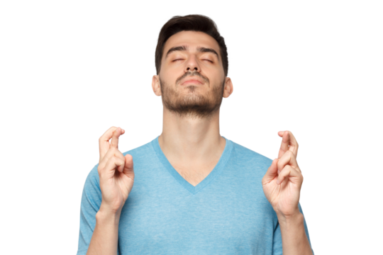 Young man with eyes closed and crossed fingers of both hands, wishing luck