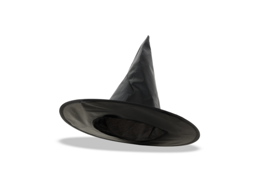 Classic witch hat with wide brim and bent tip, detailed Halloween accessory, isolated on transparent background