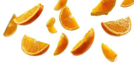 set of floated slices of orange falling isolate on withe background with orange, citrous, food, isolated, slice, fruit, fresh
