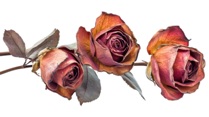 Three single rose, withered and faded, floats in the air against a transparent background