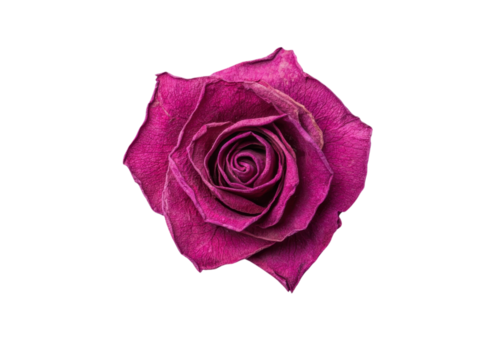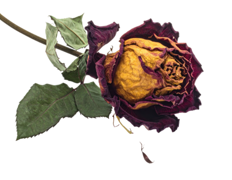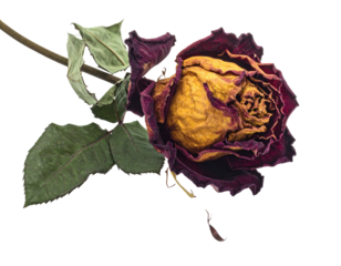Dried rose flower on transparent background. Concept of aging, death, and the passage of time.
