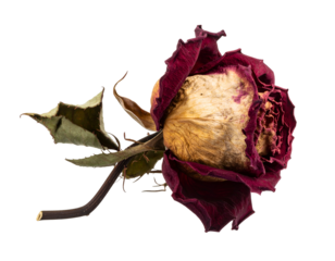 Dried rose with faded colors, showing texture and aging petals, isolated on white background.  PNG transparent.