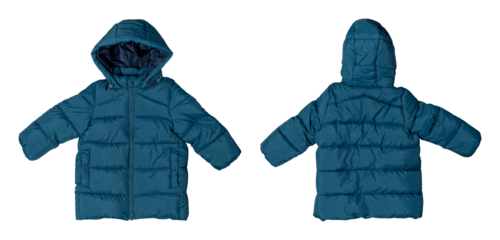 Colorful winter jacket puffer style with red blue and white stripes hooded insulated and designed for children isolated on transparency background cozy and warm
