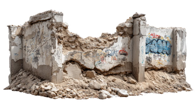 Ruins and Graffiti: Weather-beaten walls bear witness to the passage of time, bearing streaks of graffiti and crumbling under the weight of the elements. A scene of urban decay and desolation.