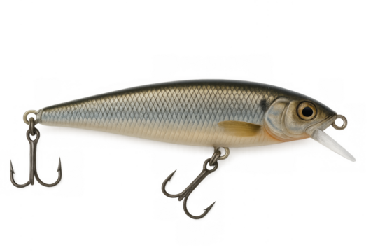 Isolated wobbler fishing lure with three hooks for predatory fish, realistic color
