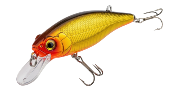 Yellow and blue fishing lure isolated PNG, wobbler with hooks for predatory fish on transparent background, fishing equipment