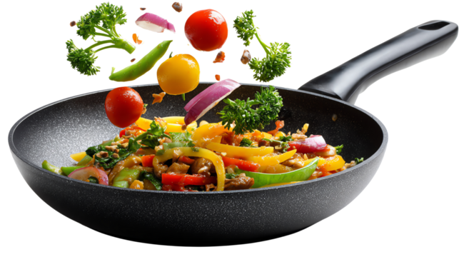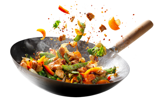 Colorful chicken stir fry with vegetables in hot wok isolated on transparent background with flying ingredients and spices