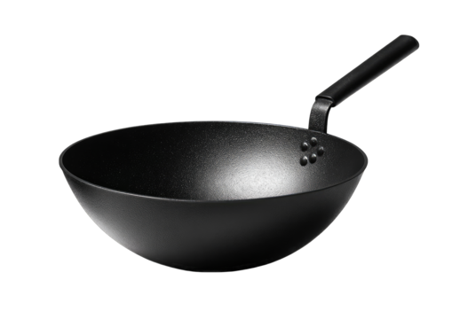 Traditional round-bottomed carbon steel wok pan with two handles, isolated on transparent background, ideal for stir-frying