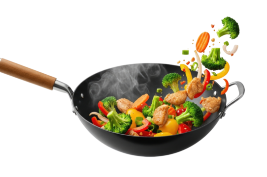 Delicious chicken stirfry with fresh vegetables in a wok isolated on transparent background, a healthy and flavorful meal perfect for any occasion