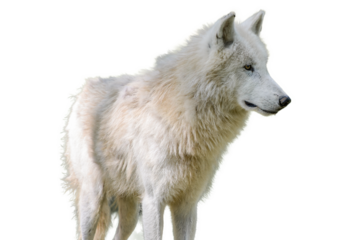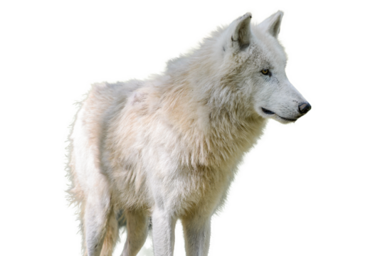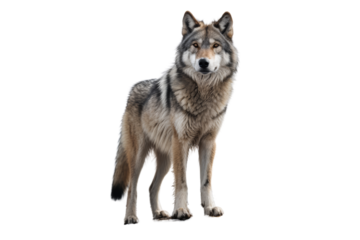 furry gray wolf Standing on a mountain, looking into the distance, Isolated on white background